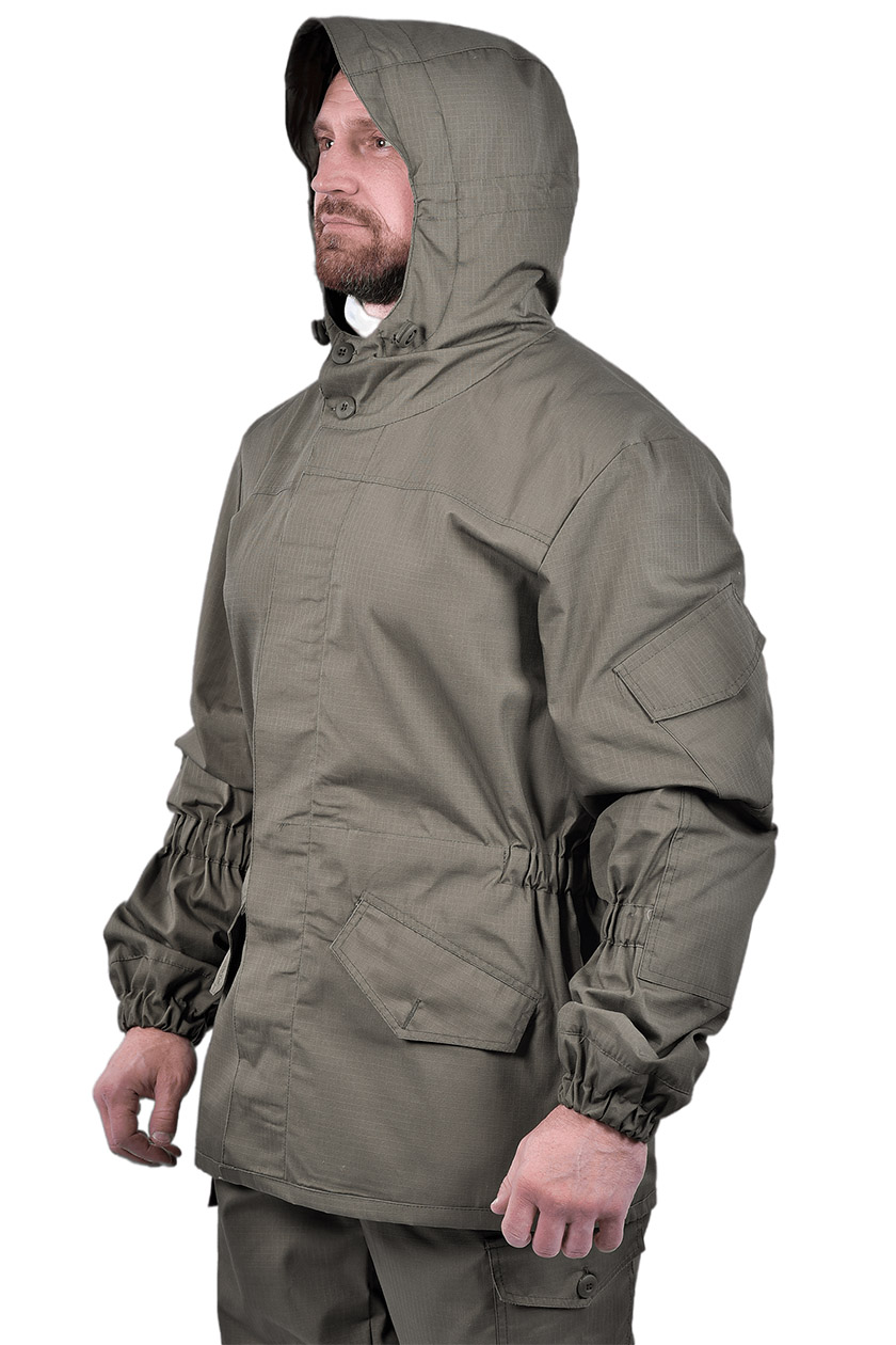 ➠ Куртка: крой прямой, супатая бортовая застежка на пуговицах. На полочках наклонные прорезные карманы с клапаном застегиваются на пуговицы. По линии талии расположена кулиса собранные на эластичную ленту. На рукавах накладные карманы с клапанами фиксирующиеся на контактную ленту, с манжетами. Области локтей усилены налокотниками. Внутренний карман на подкладке левой полочки.