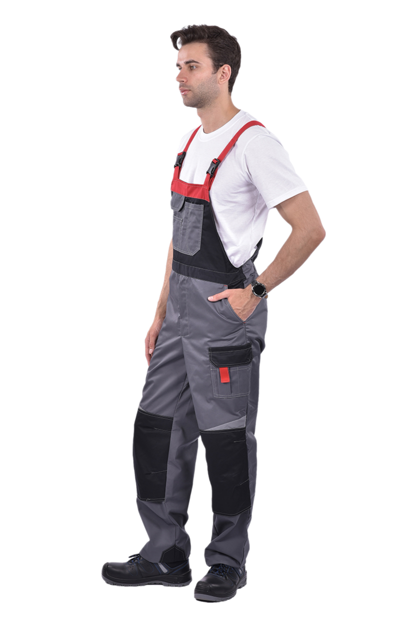 ➠ Полукомбинезон: в правом боковом шве застежка на пуговицу, в среднем шве на «молнию», карман с клапаном на грудке, боковые карманы с отрезным бочком. Колени усилены накладками, заложены по 2 вытачки. Один карман над левым наколенником. По шву наколенников косые, фигурные вставки СОП.