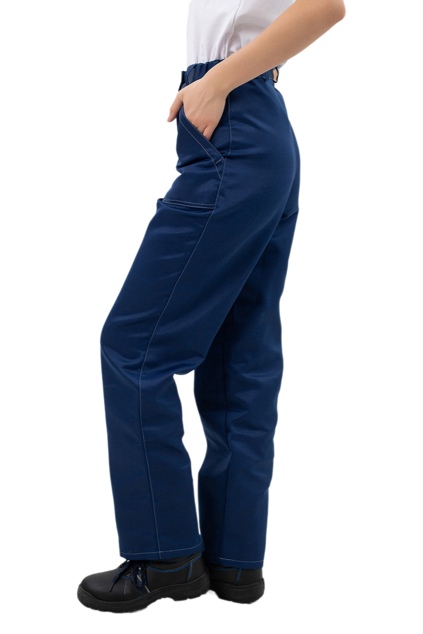 ➠ Брюки с притачным поясом, по бокам стянутый эластичной тесьмой, застежка гульфика на тесьму «молния». Передние половинки с накладными карманами с наклонным входом, с наколенниками. На поясе пять шлевок.